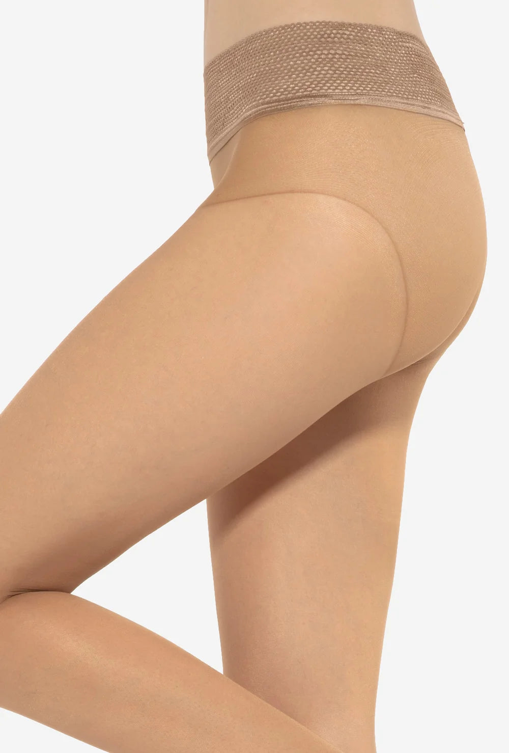- Rajstopy z bezszwową częścią majteczkową posiadają w pasie wykończenie w postaci ozdobnej gumokoronki o strukturze siateczki. Siateczka sprawia, że skóra oddycha, co jest szczególnie ważne w ciepłe wiosenno-letnie dni. Gumokoronka dobrze utrzymuje rajstopę, nie zwija się, lekko modeluje brzuch i podkreśla talię.