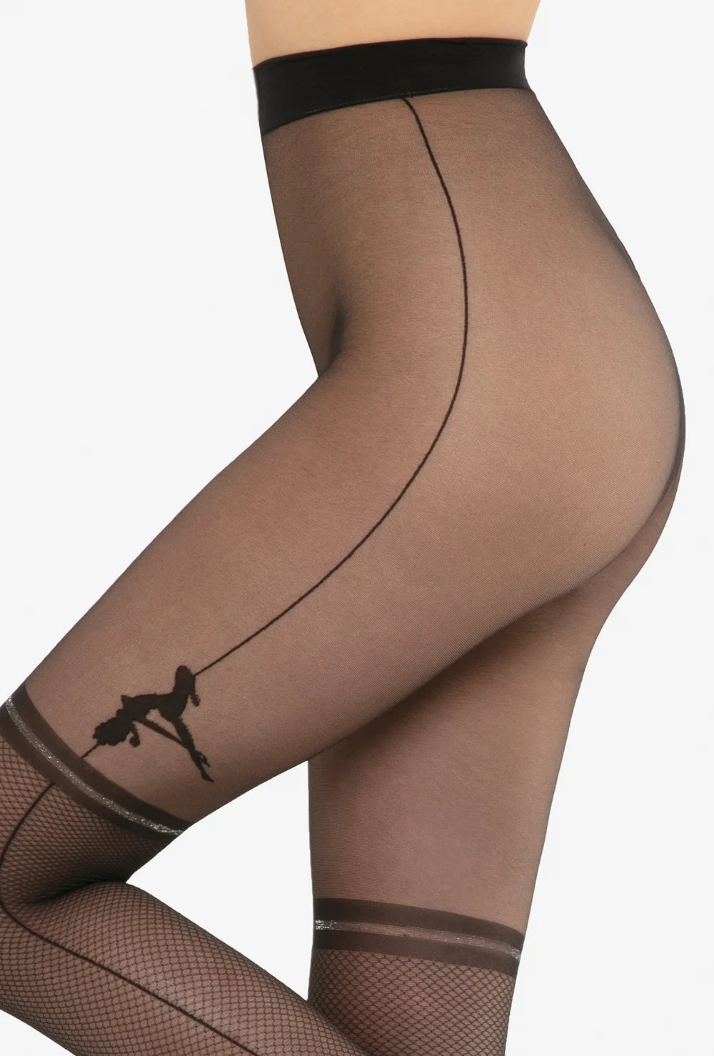 - Wzór rajstop jest inspirowany sztuką pole dance, będącą połączeniem akrobatyki, tańca oraz erotyzmu. Dolna część rajstop imituje zmysłową kabaretkę wykończoną podwiązką w kolorze srebra lub czerwieni. Górna część rajstopy jest gładka, na boku posiada imitację szwu oraz sylwetkę tańczącej na rurze kobiecie.