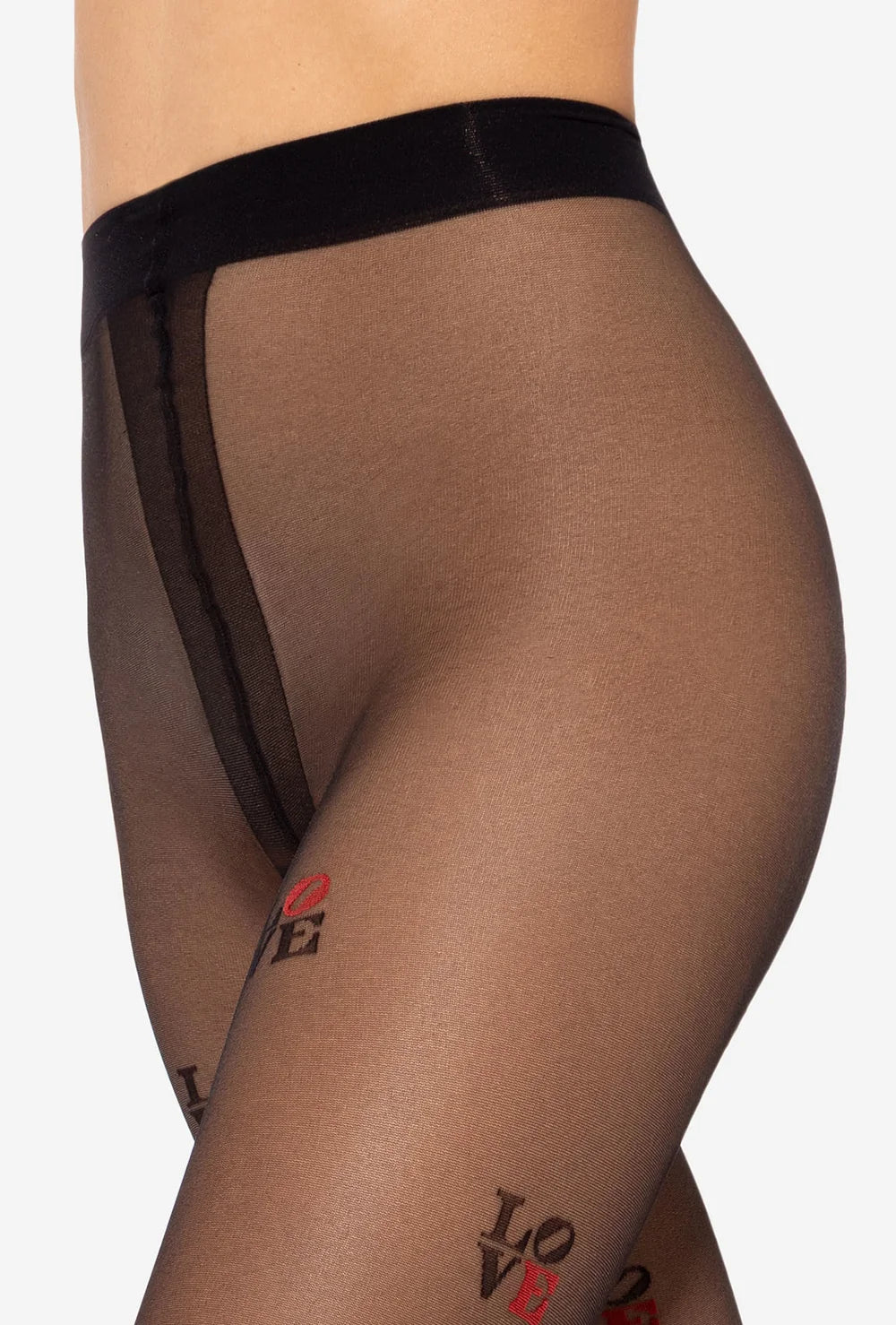 Rajstopy damskie Lovely 05 wyróżniają się na tle innych propozycji. Ich powierzchnię ozdobiono wieloma napisami LOVE i to właśnie czyni je doskonałym elementem walentynkowych i romantycznych stylizacji.