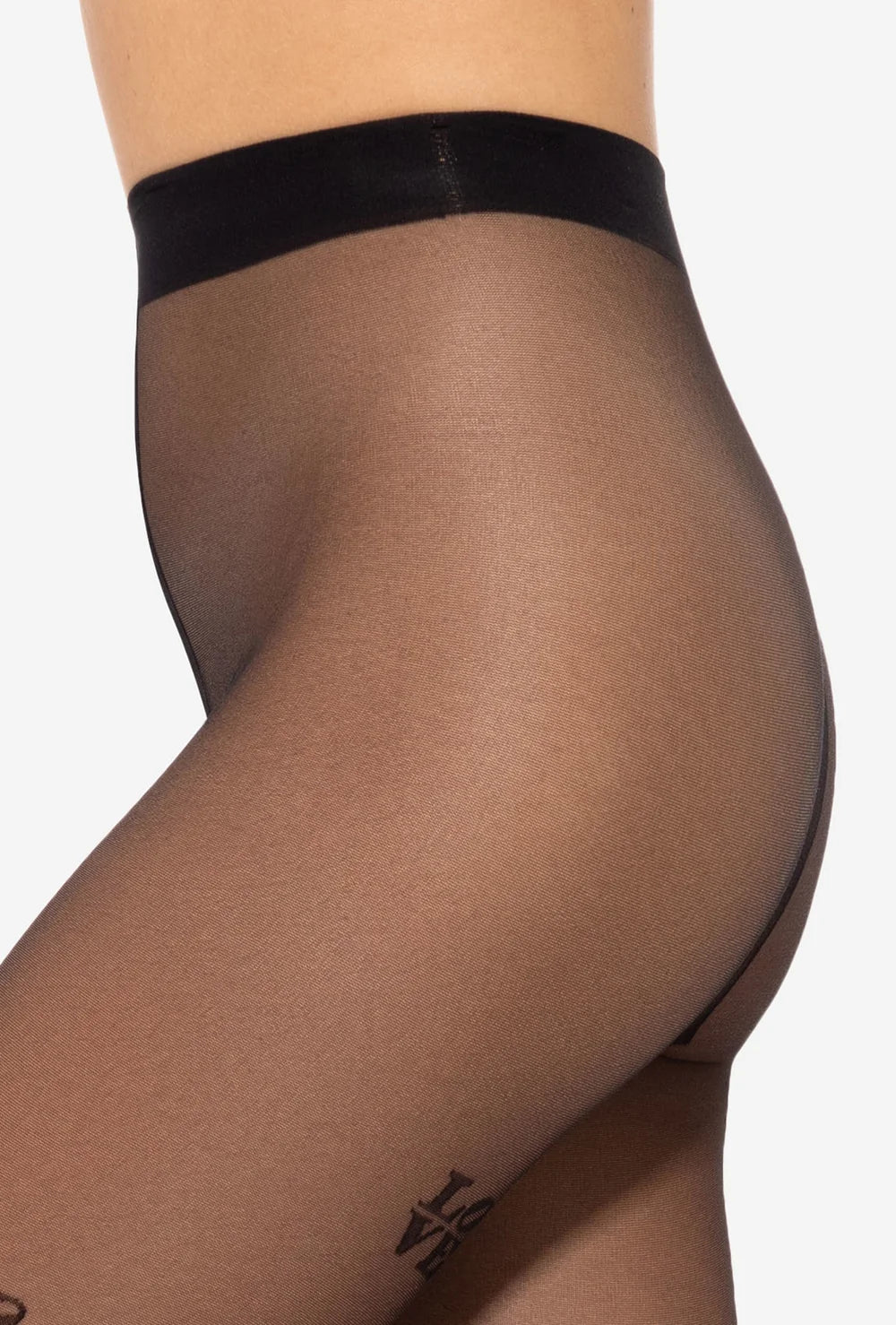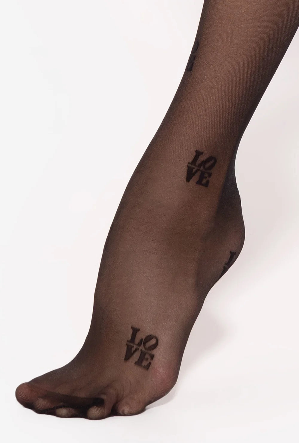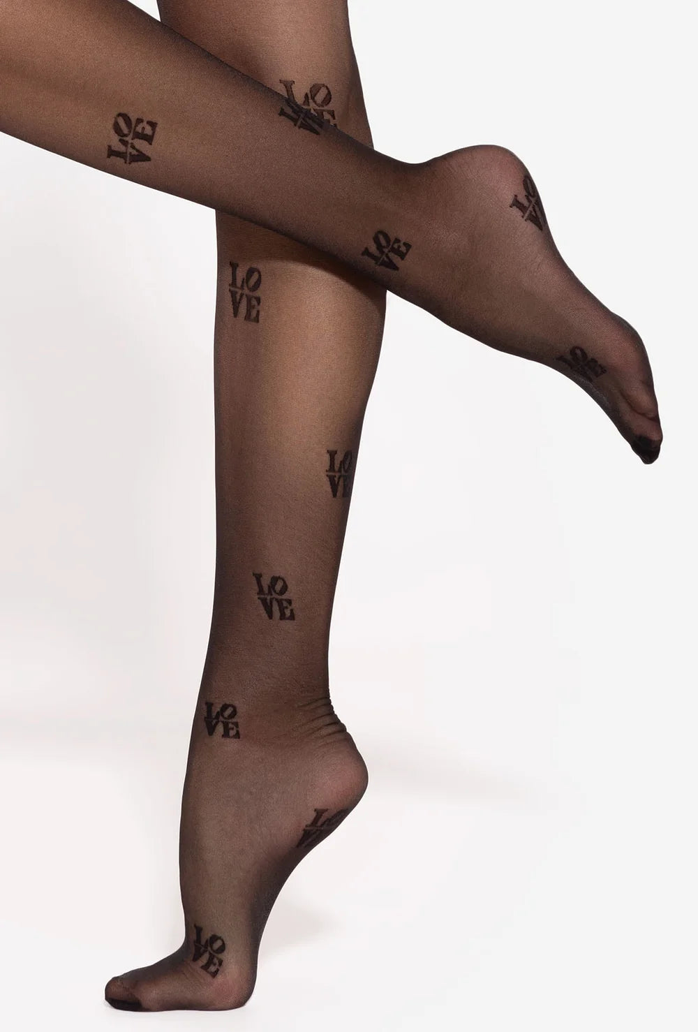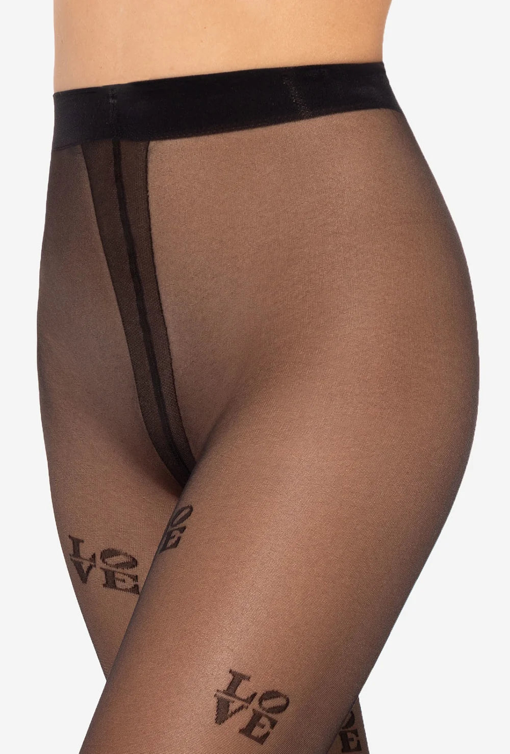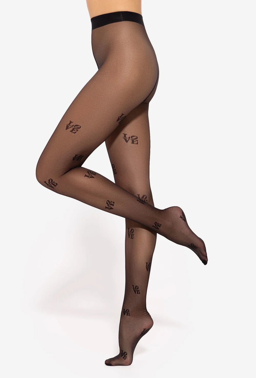 Rajstopy damskie Lovely 05 wyróżniają się na tle innych propozycji. Ich powierzchnię ozdobiono wieloma napisami LOVE i to właśnie czyni je doskonałym elementem walentynkowych i romantycznych stylizacji.