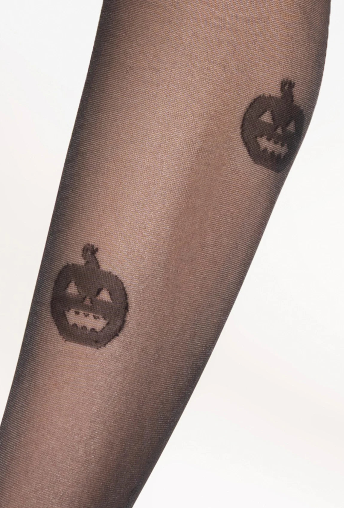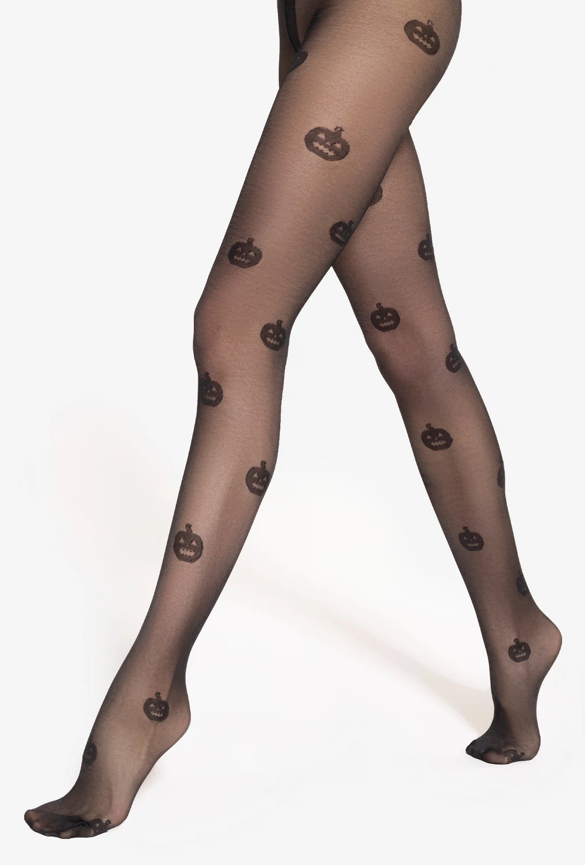 Rajstopy Gatta Crazy Trick 04 w kolorze Nero to wyjątkowy model stworzony z myślą o kobietach, które lubią wyróżniać się stylem. Cienkie, transparentne rajstopy z motywem halloweenowych dyń przyciągają wzrok i wprowadzają do stylizacji odrobinę zabawy w eleganckim wydaniu. Delikatny wzór rozmieszczony na całej długości nóg doskonale komponuje się z klasyczną czernią, tworząc efekt modnego, jesiennego dodatku.