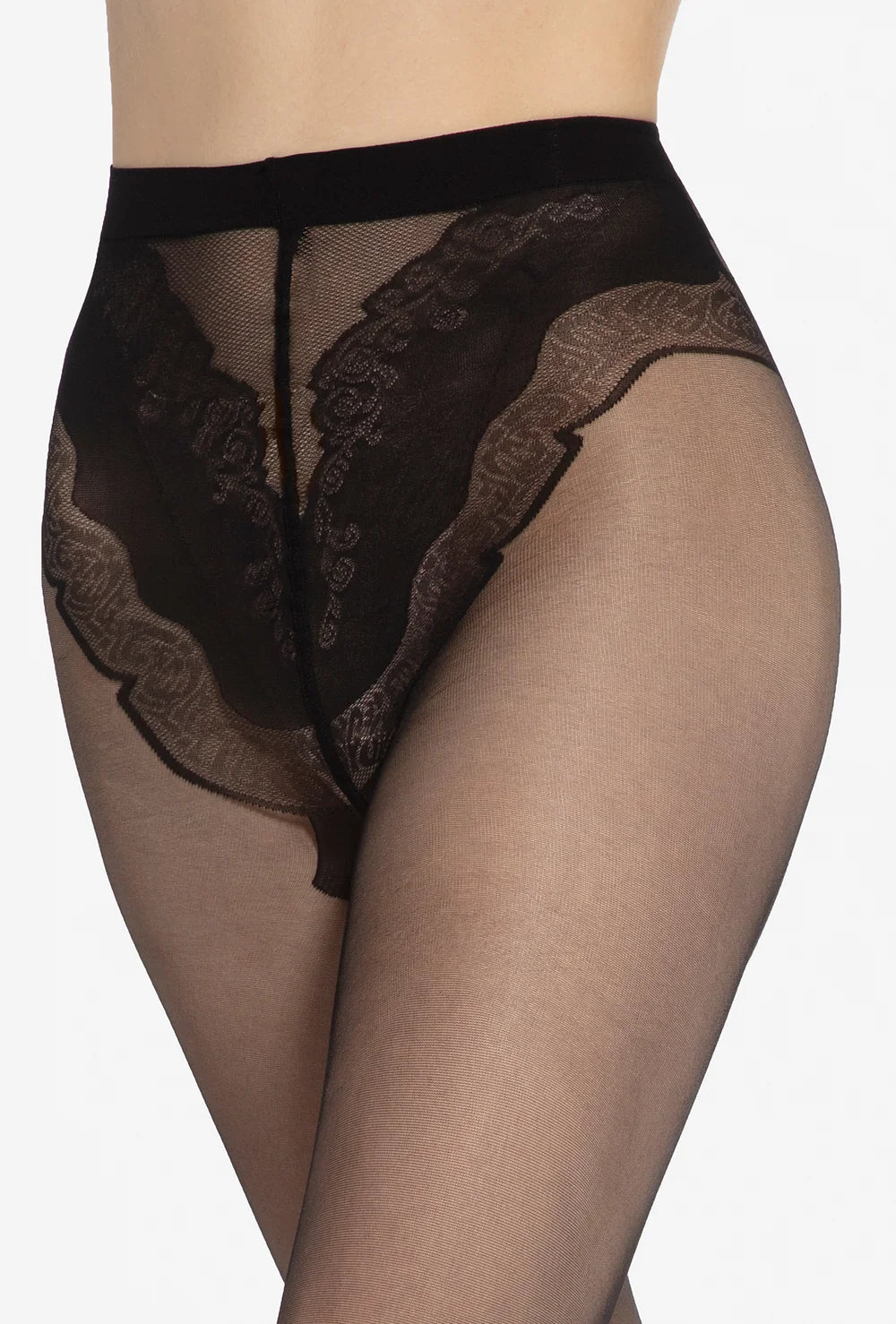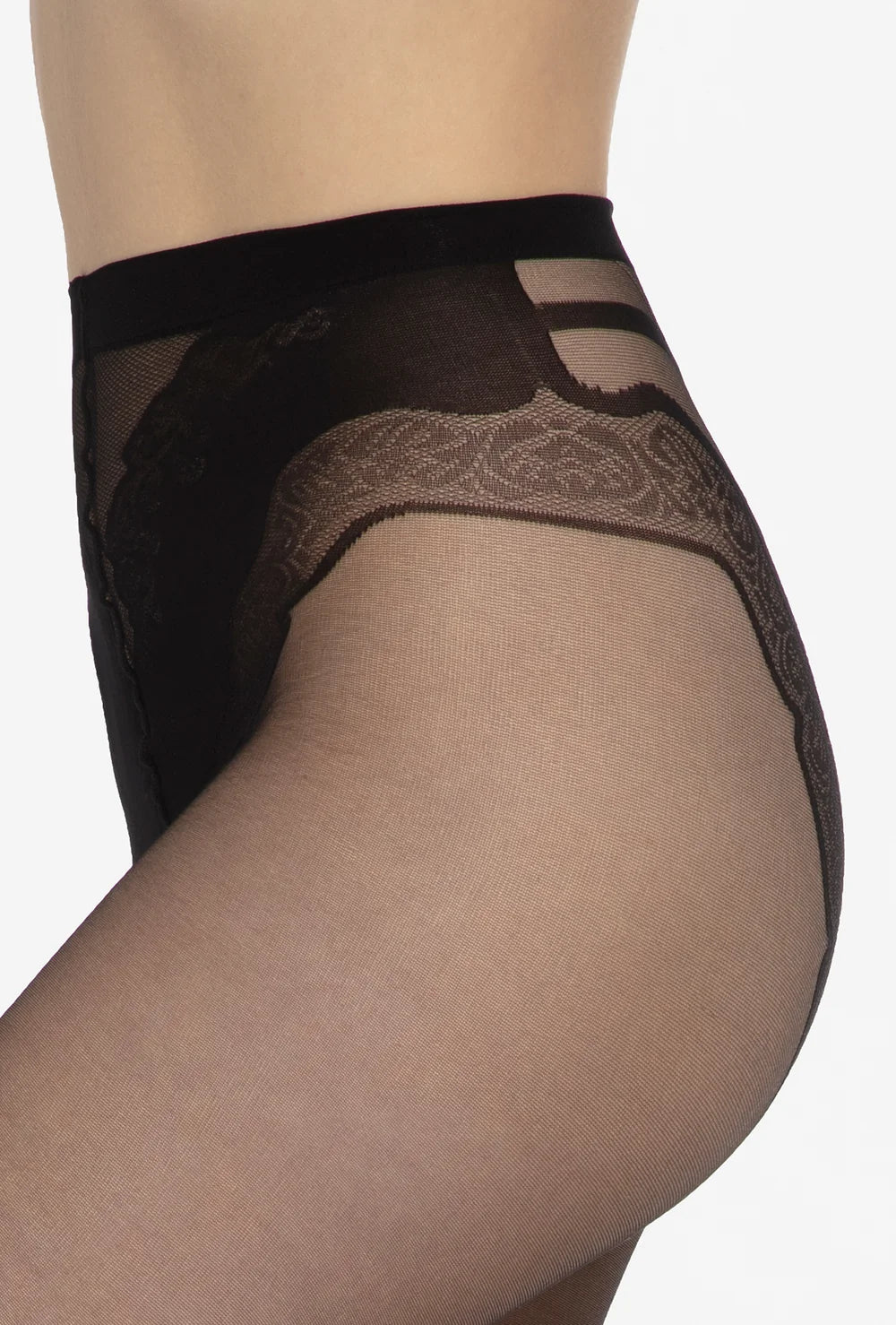 - Unikalne wykorzystanie nadruku pozwoliło osiągnąć spektakularny efekt w postaci ozdobnej części majteczkowej w klasycznych rajstop Astrea. Zarysowane ciemnym kolorem kontury tworzą szeroki pasek, przebiegający w połowie pośladków - imitując w ten sposób tradycyjne, pełne figi. Ponadto technologię nadruku zastosowano także do naniesienia wstążek zbiegających się w tylnej części w jednym punkcie - tuż nad kością ogonową, którą przysłania kokieteryjna kokardka.