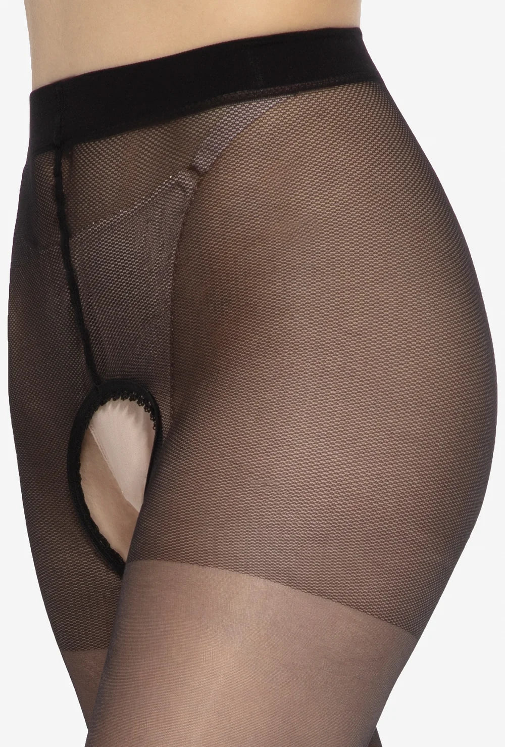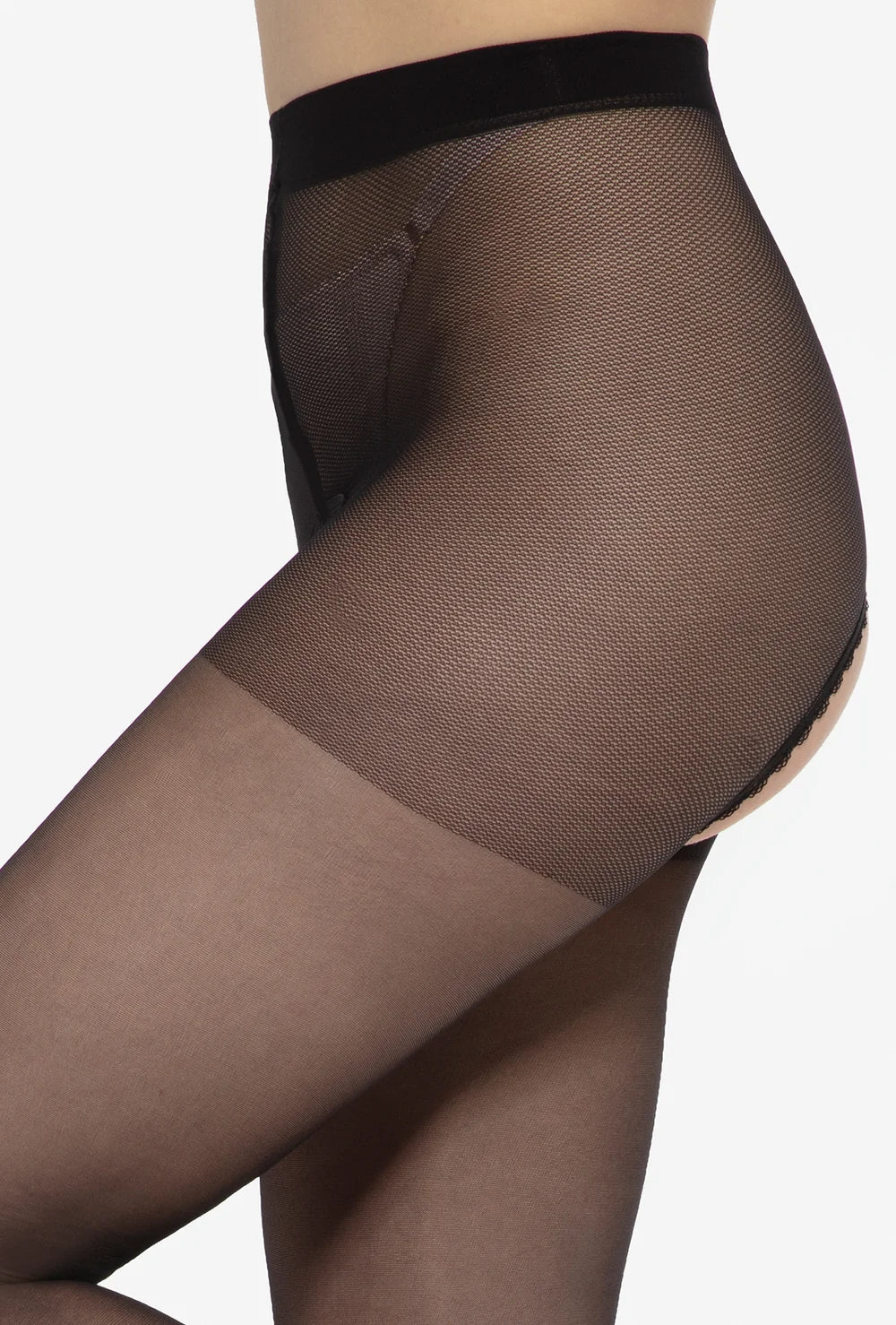 - Pikanterii klasycznym rajstopom dodaje zmysłowe wykończenie tylnej części. Wycięta tylnia część obejmuje strefy intymne, to odważna propozycja dla kobiet, które nie boją się swojej seksualności i chętnie podejmują nowe wyzwania w sztuce kochania. Wycięcie obszyte jest elastyczną i ozdobą gumkokoronką, dzięki czemu na wrażliwej skórze nie powstają otarcia.