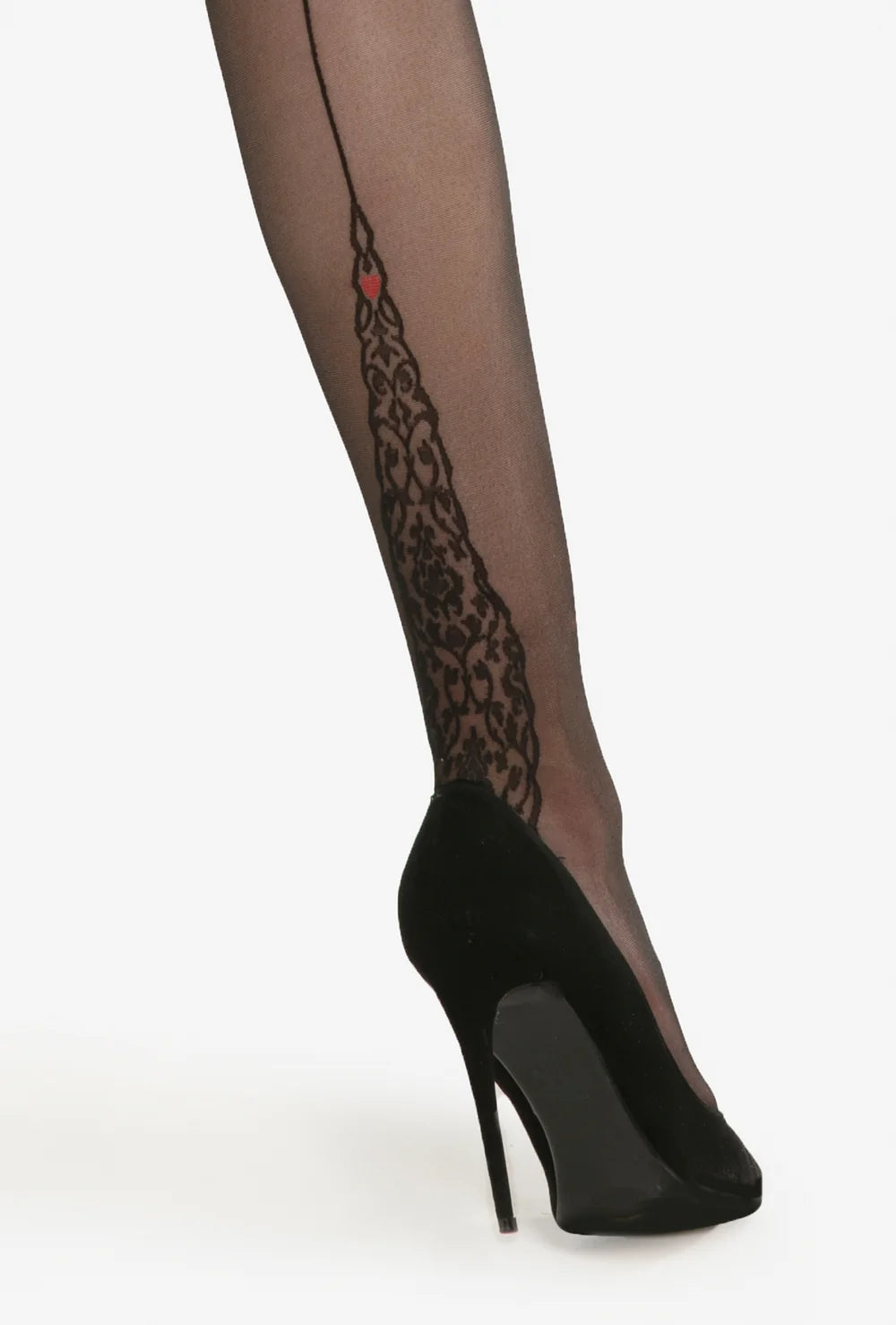 - Część majtkowa typu T-band została ozdobiona wzorem przypominającym kwiatową koronkę. Z tyłu nogawek na całej długości znajduje się zmysłowy szewek, który od połowy łydki zmienia się w imitujące koronkę wykończenie biegnące do pięty z czerwonym serduszkiem.