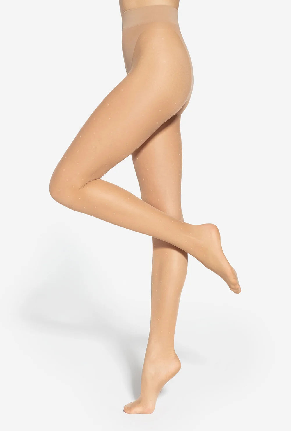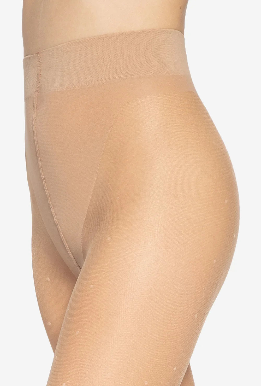 - Rajstopy w kropki ze wzmocnioną częścią majteczkową typu T-band będą doskonałym uzupełnieniem stylizacji na specjalne okazje lub wieczorne wyjścia.