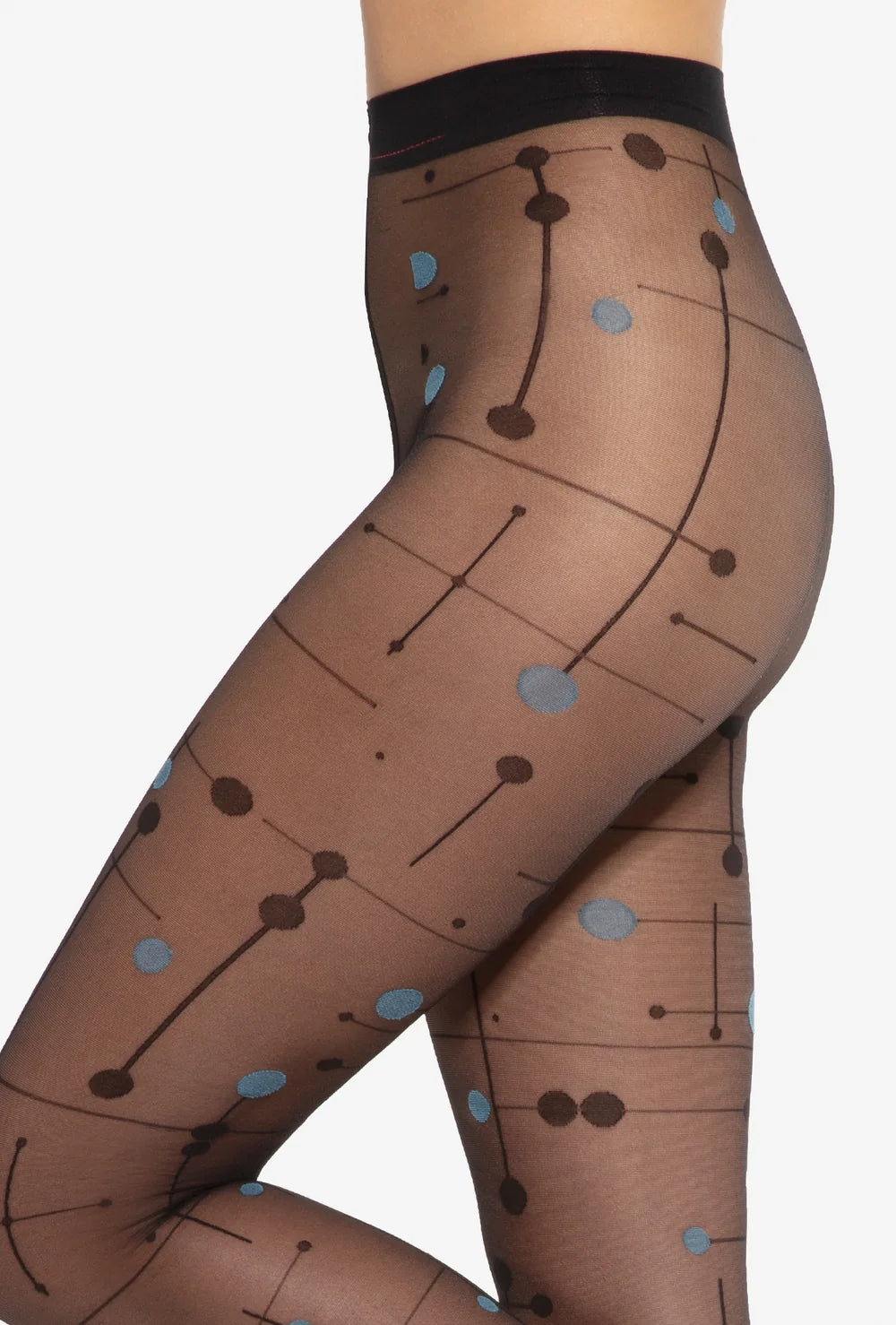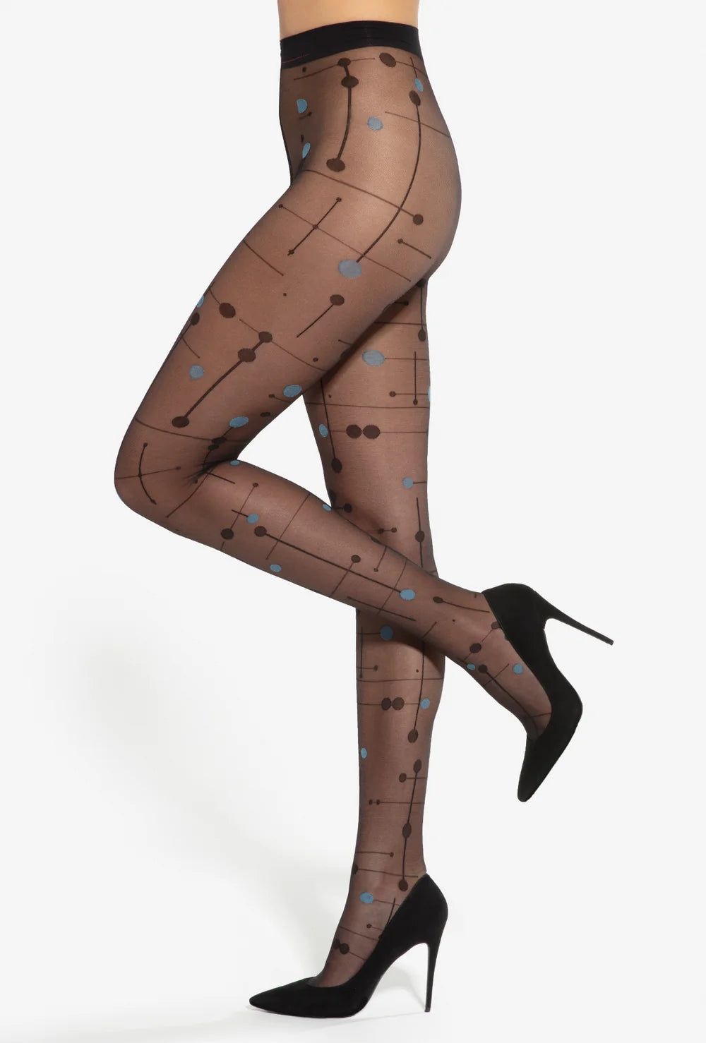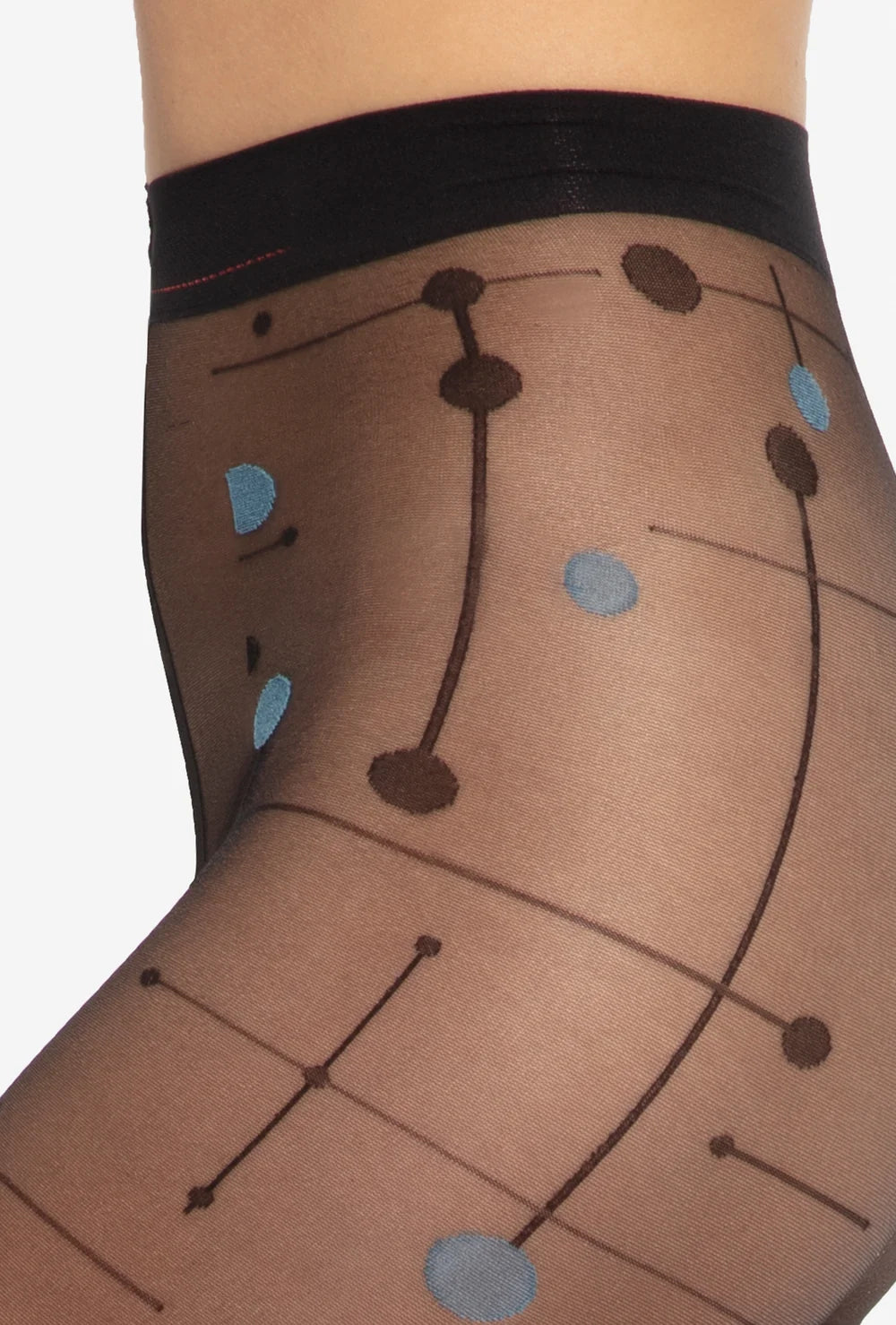Duże grochy w kolorach czerni i błękitu oraz geometryczne linie tworzą nieco zadziorny i bardzo wyrazisty wzór. Rajstopy w niepowtarzalny sposób uzupełnią wiosenne stylizacje podkreślając Twój indywidualizm i poczucie stylu.