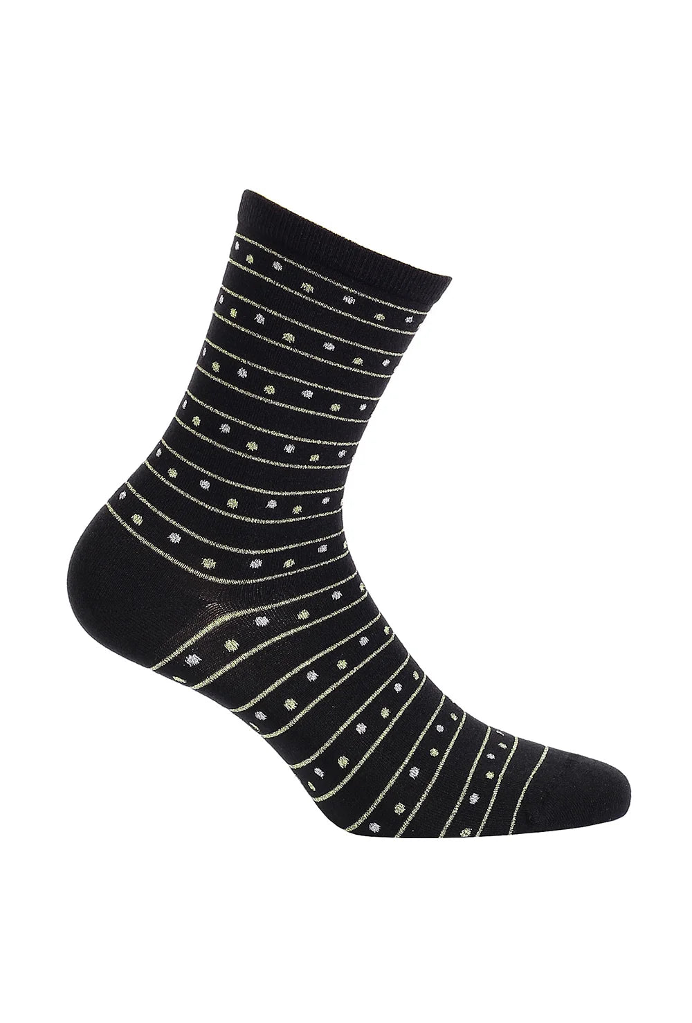 Skarpetki damskie wz. 997 w czarnym kolorze to uniwersalna propozycja na sezon jesień–zima. Klasyczna, ciemna baza została uzupełniona wzorzystym akcentem, który nadaje modelowi wyrazistości i nowoczesnego charakteru. To dodatek, który doskonale wpisuje się w codzienne stylizacje.