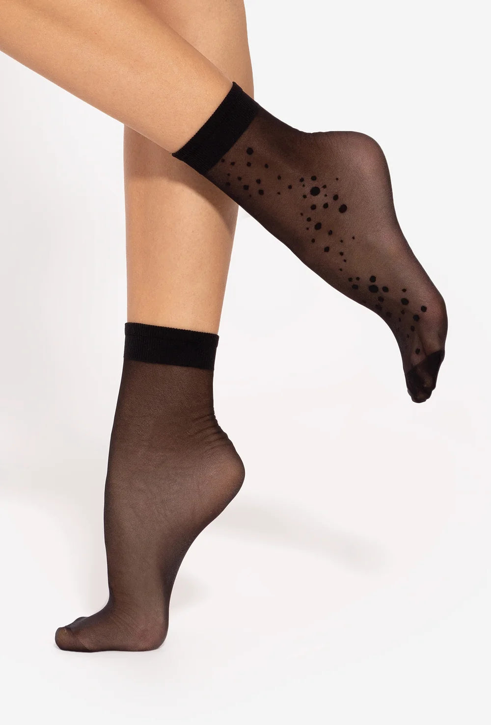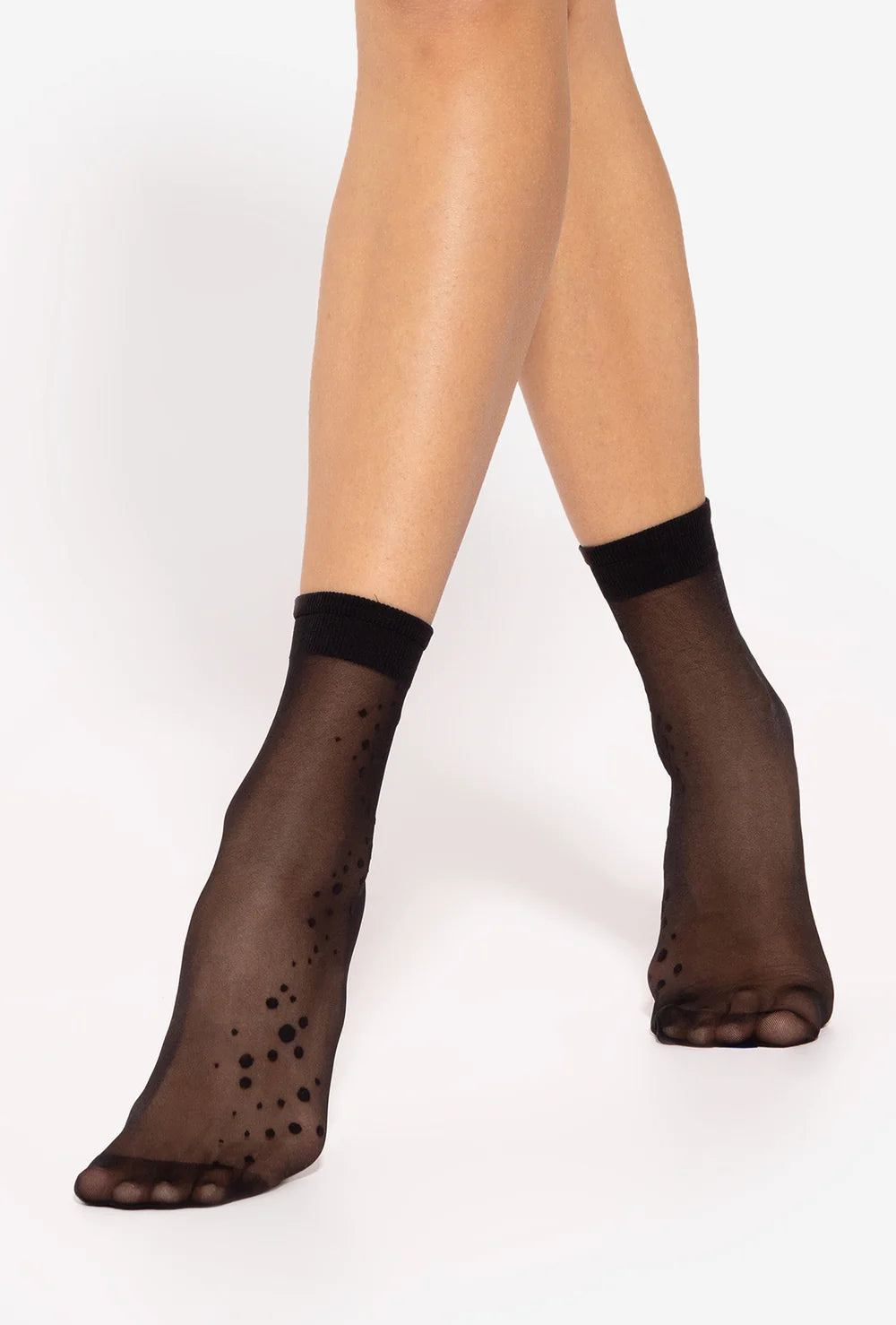 Produkt ten jest dostępny w dwóch odsłonach kolorystycznych: czarnej i beżowej. Obie mogą Ci się przydać do wielu różnorodnych stylizacji. Cielista wersja skarpetek z daleka jest niemal niezauważalna - z wyjątkiem uroczych kropeczek, które są rozsypane wzdłuż stopy niczym konfetti. Czarna odsłona od razu wpada w oko i przykuwa uwagę.