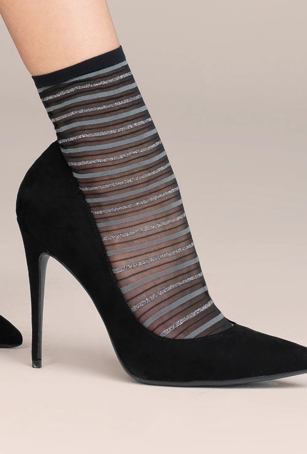 Połączenie szpilek ze skarpetkami to prawdziwy hit sezonu. Skarpetki rajstopowe w paski świetnie łączą nieco figlarny, dziewczęcy styl z ponadczasową klasyką. Cienkie skarpetki z paskami pasują do czółenek czy sandałów na obcasie, stanowiąc niebanalne i niezwykle modne uzupełnienie stylizacji. Wzór tworzą trzy poziome linie o różnej grubości, jednak zastosowanie stonowanej kolorystyki pozwala zakładać je na każda okazję.