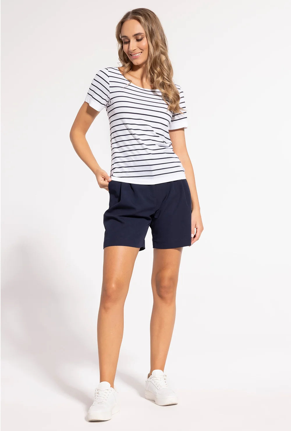 Krótkie spodenki z zakładkami Daiane są już na Twojej liście zakupów, ale nie wiesz, jak je stylizować? Co powiesz na strój w stylu marine? Połącz szorty z białą bluzką w czarne paski, białymi trampkami i słomianą torebką. Całość dopełnij okularami przeciwsłonecznymi i apaszką na szyi. W wydaniu smart-casual trampki zamień na sandały na słupku, a na ramiona zarzuć granatową marynarkę oversize - strój na kolację przy zachodzie słońca gotowy! Zdecyduj się na zakup naszych granatowych szortów z wysokim stanem i twórz niezapomniane letnie stylizacje!