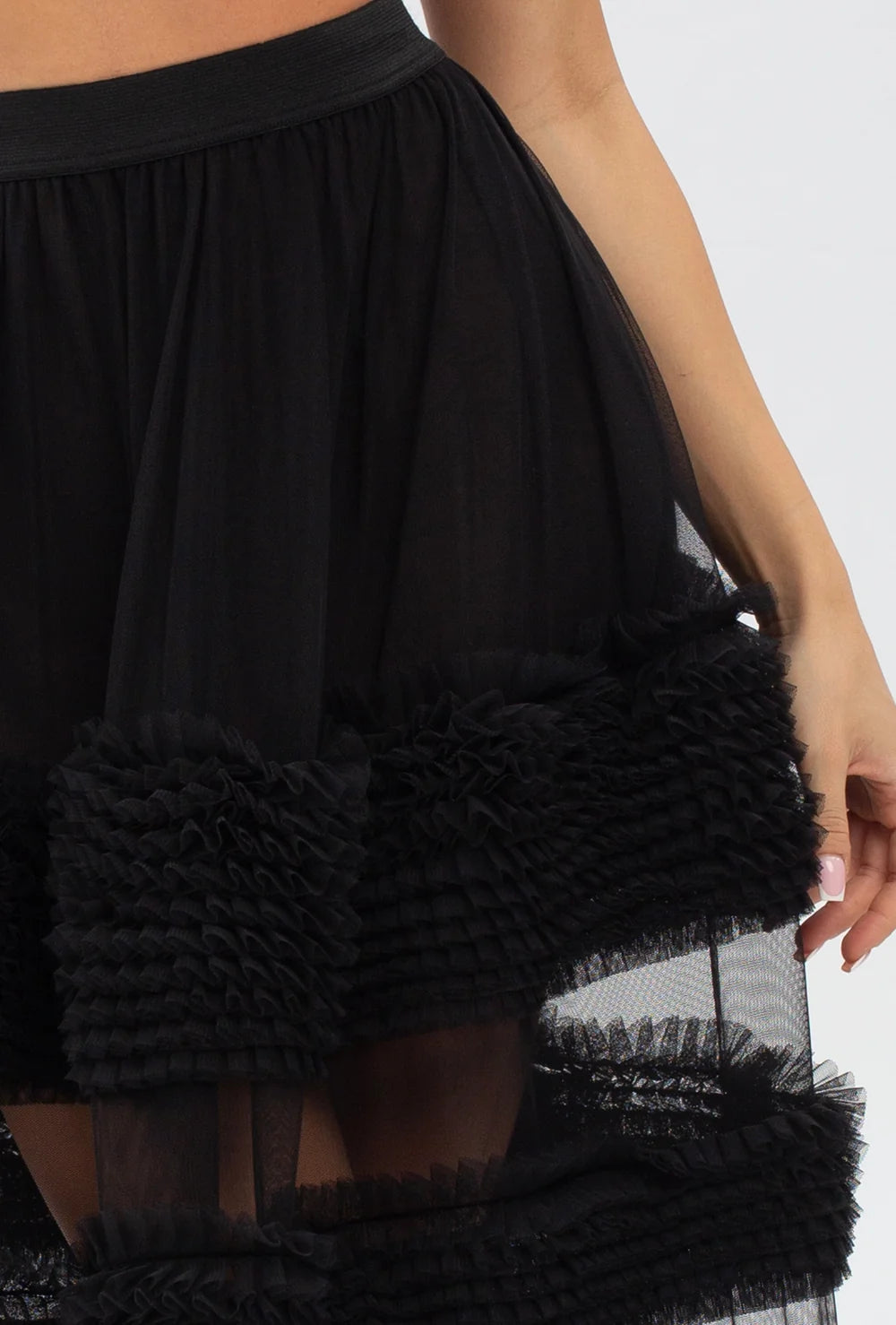 Spódnica Splendor została uszyta z poliestrowego tiulu - jest to materiał charakteryzujący się lekkością i zwiewnością, a jednocześnie pięknie układający się w ruchu. Mocnym atutem tego modelu jest również częściowa transparentność - pasy cienkiego i prześwitującego tiulu przeplatają się z fragmentami o wysokim stopniu krycia. Efekt jest imponująco zmysłowy.