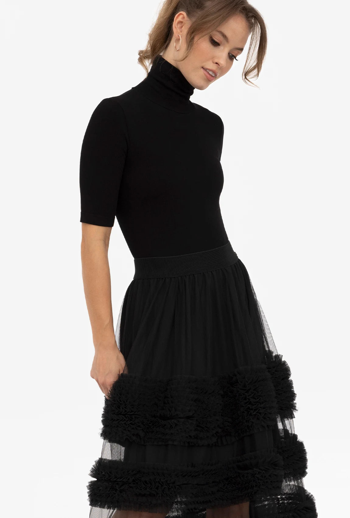 Spódnica Splendor została uszyta z poliestrowego tiulu - jest to materiał charakteryzujący się lekkością i zwiewnością, a jednocześnie pięknie układający się w ruchu. Mocnym atutem tego modelu jest również częściowa transparentność - pasy cienkiego i prześwitującego tiulu przeplatają się z fragmentami o wysokim stopniu krycia. Efekt jest imponująco zmysłowy.