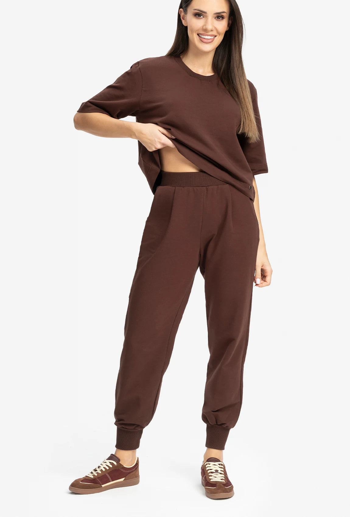 Model został opisany jako spodnie o sportowym kroju, dlatego dobrze wpisuje się w codzienną garderobę i luźniejsze stylizacje. Kolor Choco podkreśla ich spokojny, uniwersalny charakter i dobrze komponuje się z jasnymi beżami, écru, czernią czy innymi stonowanymi barwami. Gładka forma bez wzoru sprawia, że spodnie pozostają łatwe do zestawiania.
