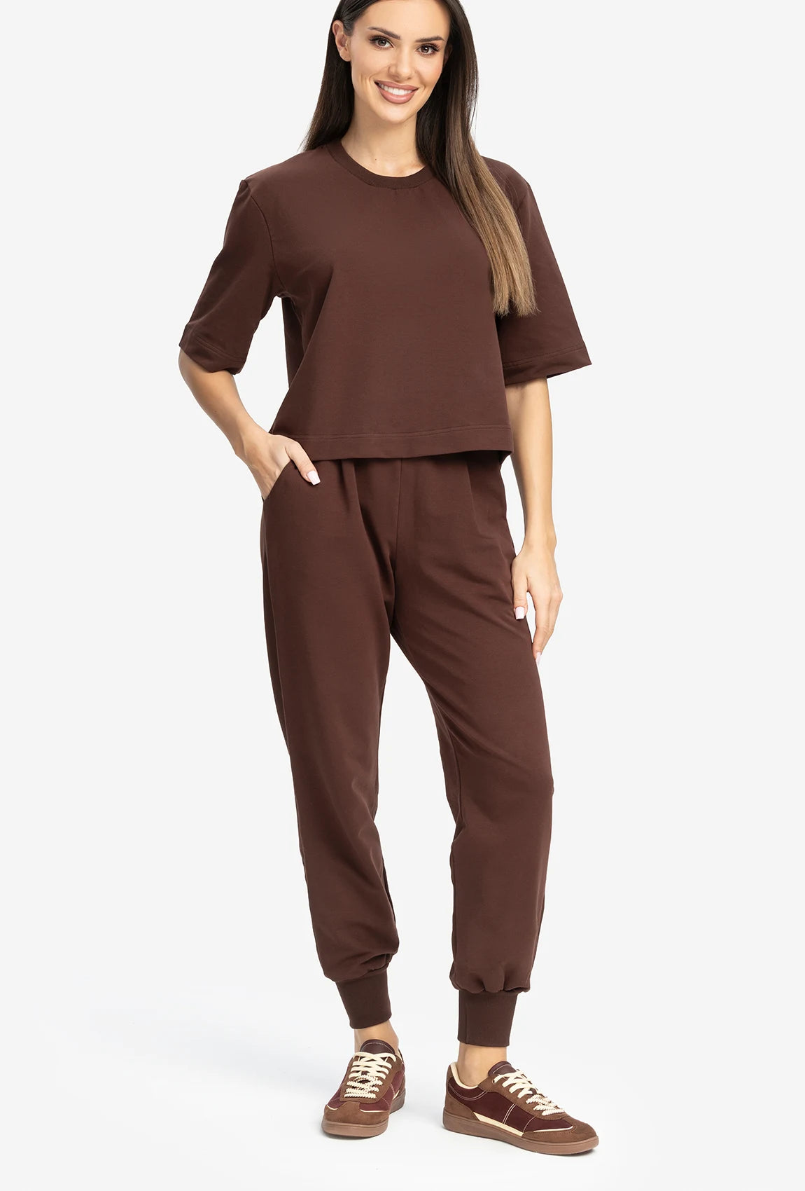 Spodnie Marilla 02 w kolorze Choco to model, który łączy codzienną wygodę z ciepłą, nasyconą kolorystyką. Brązowy odcień nadaje całości spokojnego, naturalnego charakteru, a sportowy krój sprawia, że fason prezentuje się swobodnie i nowocześnie. To propozycja dla kobiet, które cenią komfort oraz proste modele w bardziej otulającej tonacji.