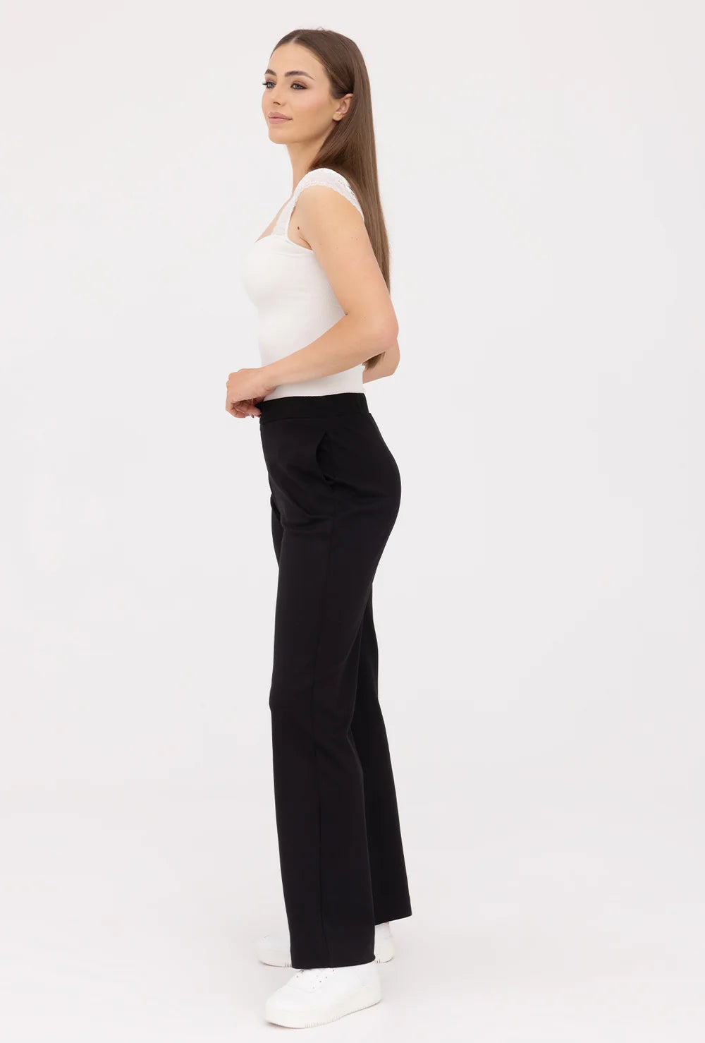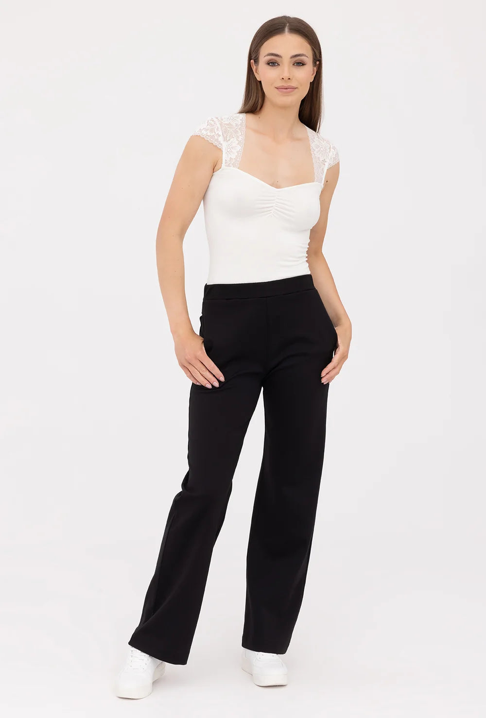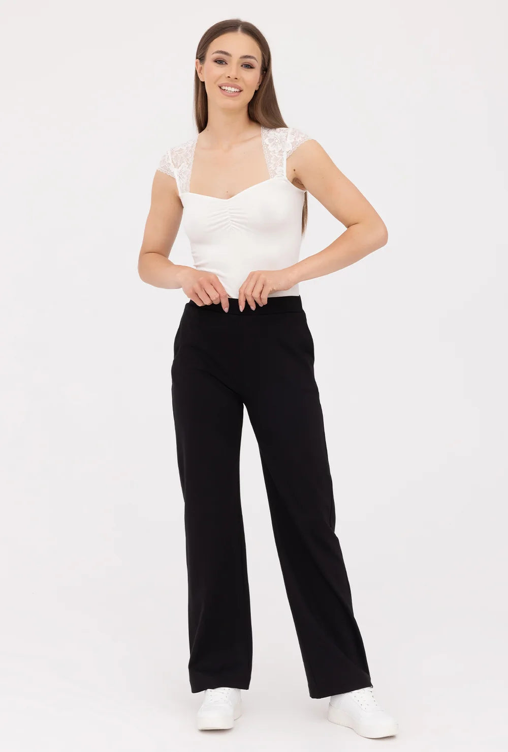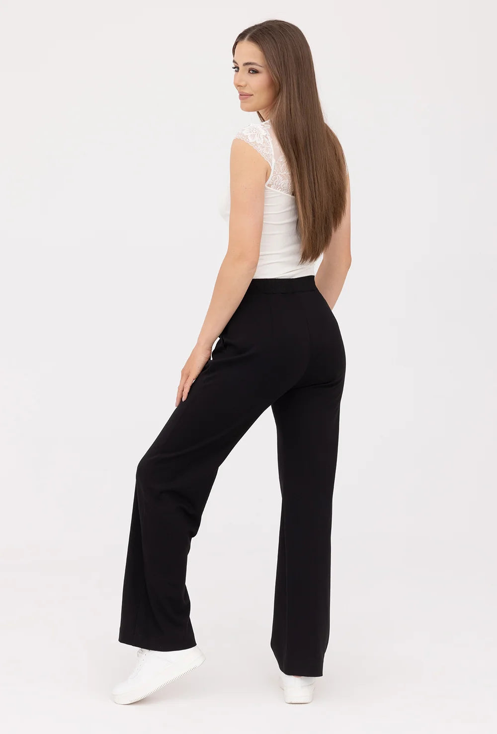 Są takie ubrania, które zawsze warto mieć pod ręką, ponieważ stanowią one idealną bazę do wielu outfitów. Jedną z takich rzeczy są czarne spodnie z szerokimi nogawkami Rosa marki Gatta. Spodnie pokochasz m.in. za komfort, który zapewnią Ci podczas ich noszenia. Nasze czarne spodnie wide leg posiadają elastyczną gumę pasie, która dopasuje się do kształtu ciała oraz jego ruchów, a także boczne kieszenie, w których pomieścisz wszystkie niezbędne drobiazgi. Połącz je z białym T-shirtem i sneakersami, by stworzyć look na co dzień, w którym będziesz czuć się dobrze i tak też wyglądać.