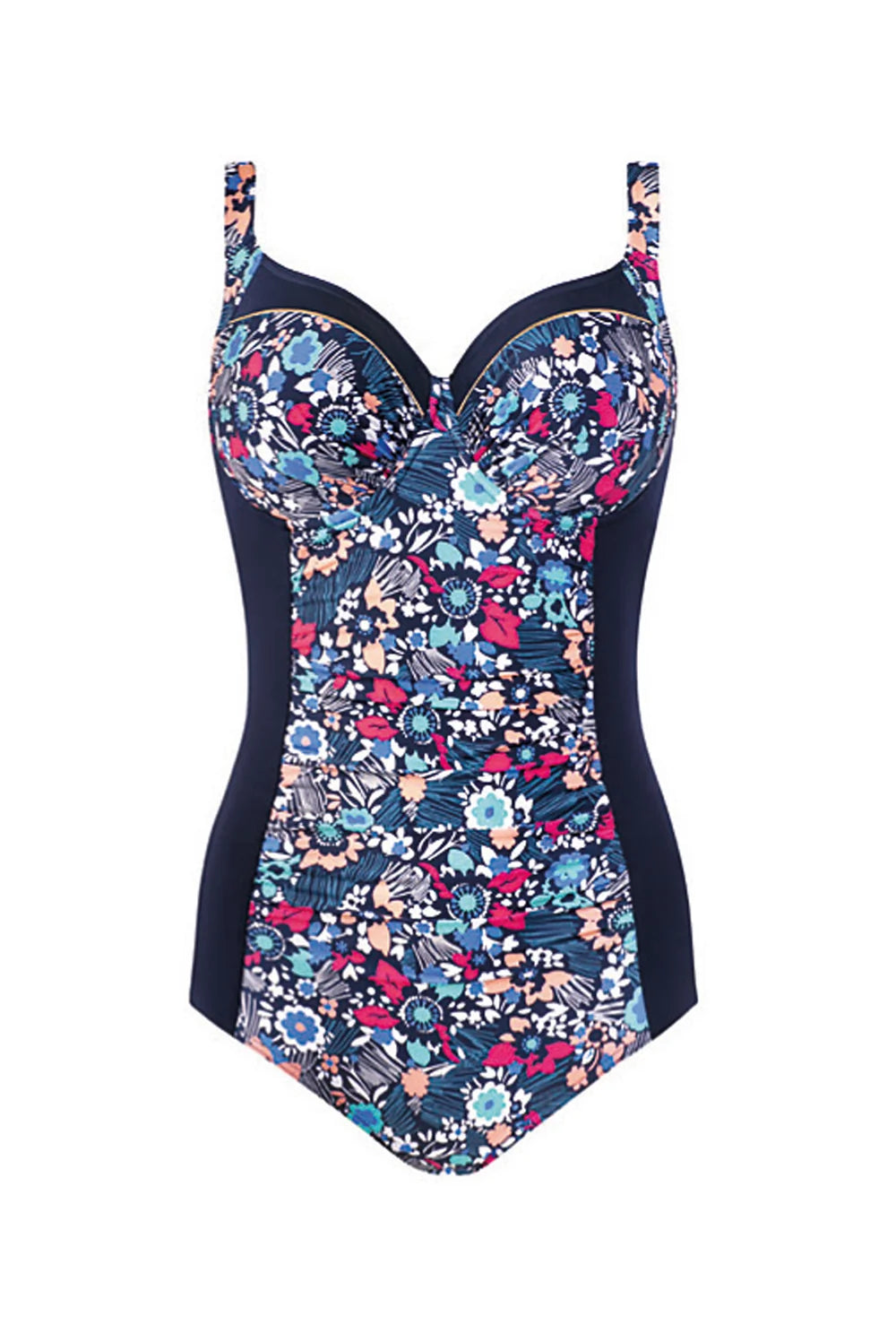 Granatowe tło w połączeniu z kwiatowym wzorem nadaje kostiumowi wyrazisty, wakacyjny wygląd. Motyw roślinny wprowadza lekkość i sprawia, że model prezentuje się świeżo w letnich stylizacjach nad wodą.