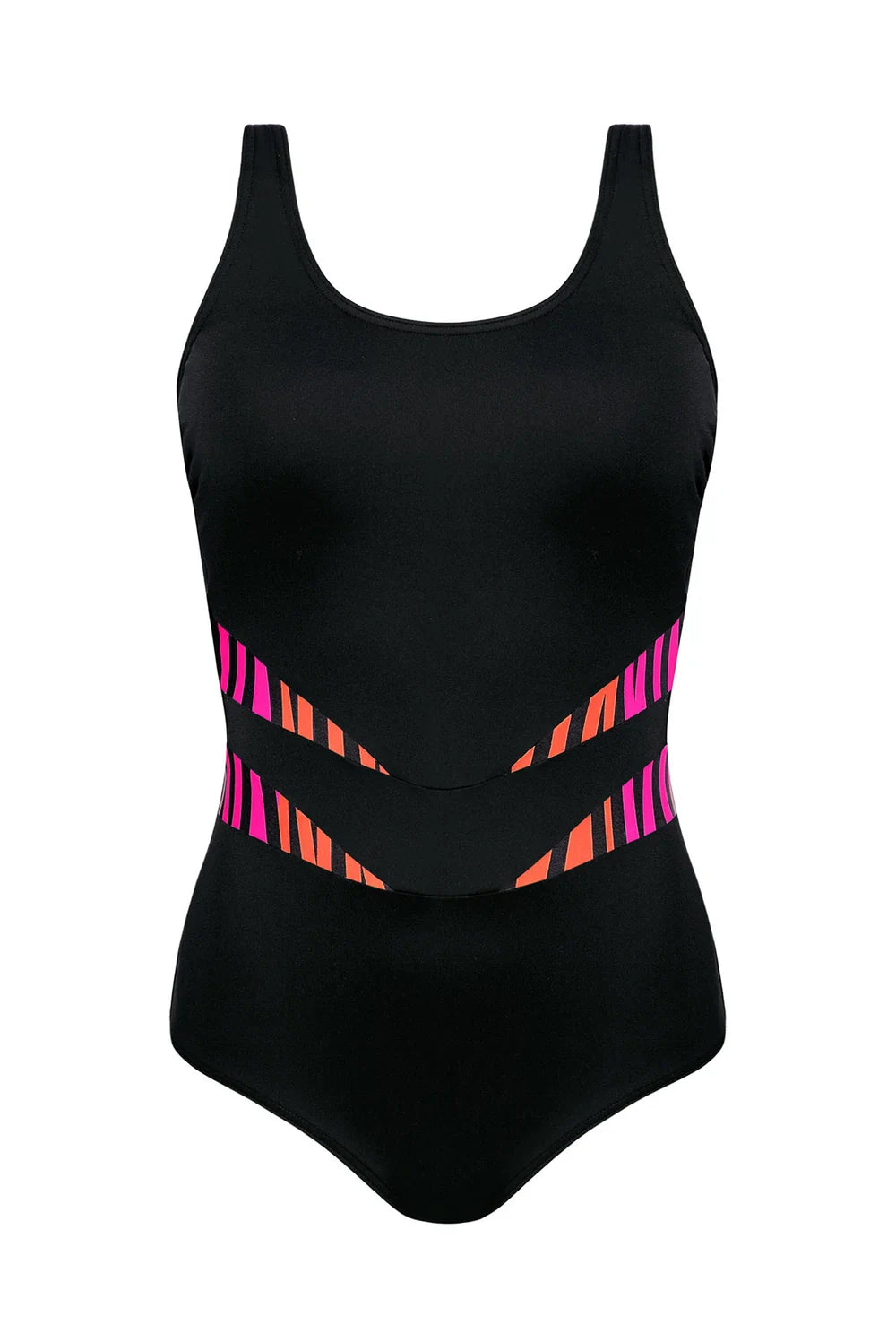 Damski kostium kąpielowy Pacific sport 20 to model, który doskonale sprawdzi się podczas pływania - szczególnie na basenie. Wynika to zarówno z jego przemyślanego kroju, jak i materiału wykonania. To strój jednoczęściowy, który jest opływowy i doskonale przylegający do sylwetki. Wyposażono go w szerokie ramiączka z regulacją długości. Kostium ten jest utrzymany w klasycznej czerni, którą urozmaicono geometrycznymi wstawkami w talii - detale te podkreślają sylwetkę i optycznie ją modelują.