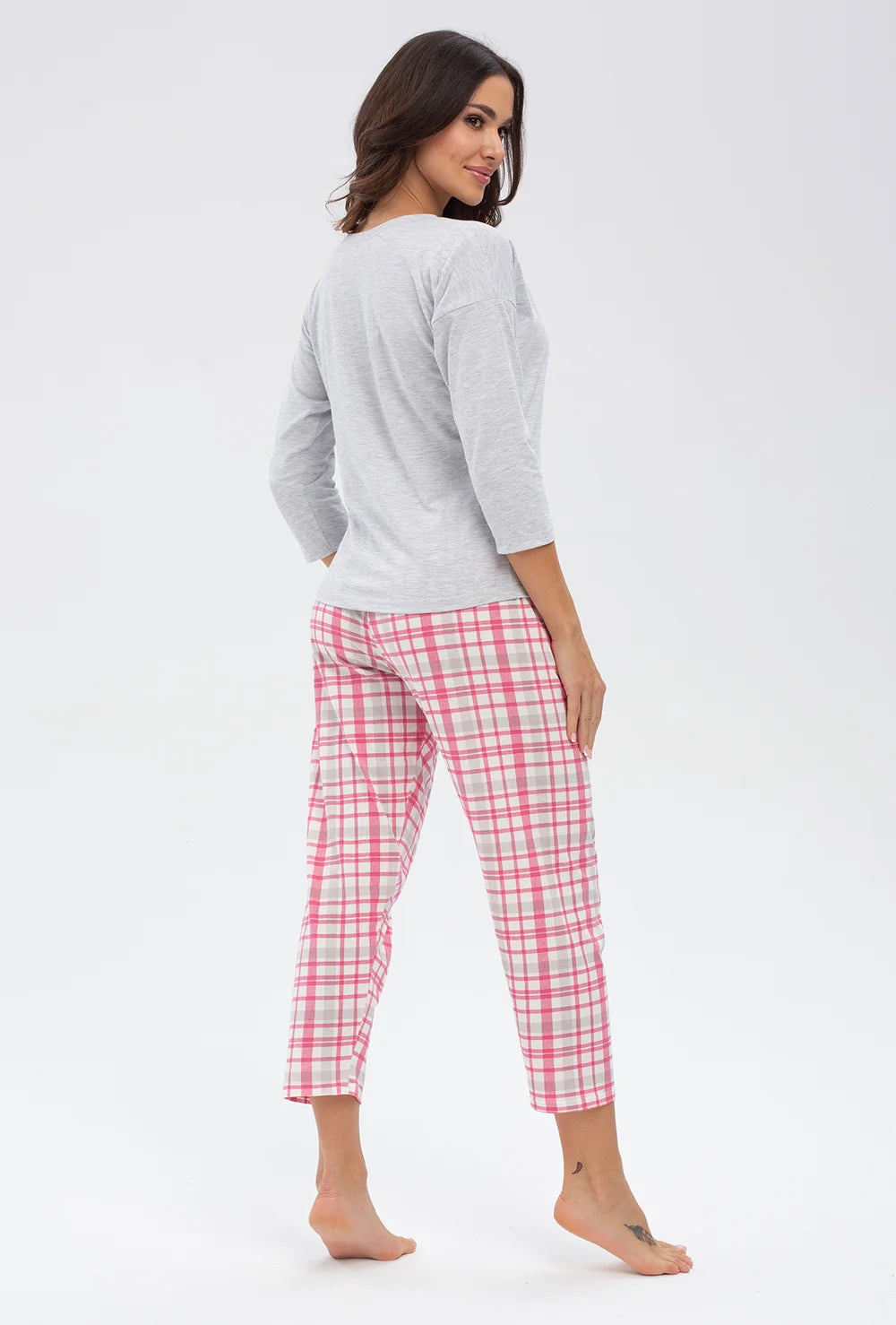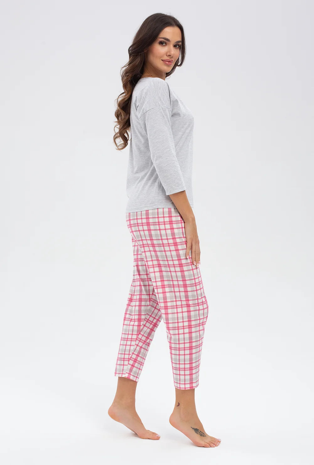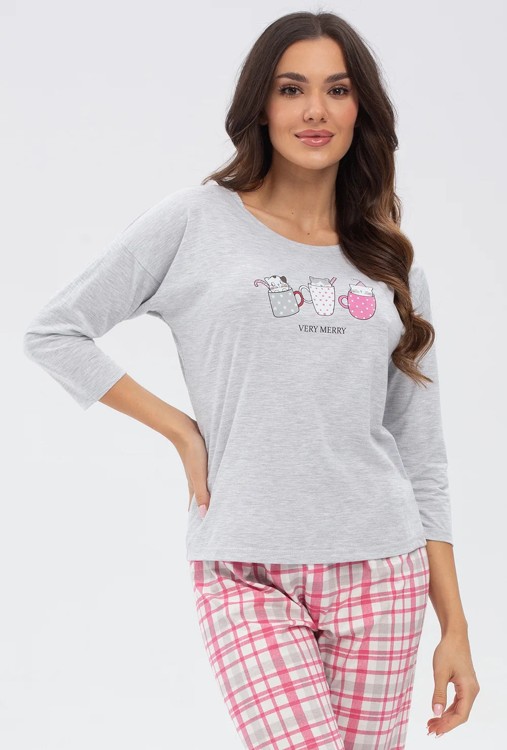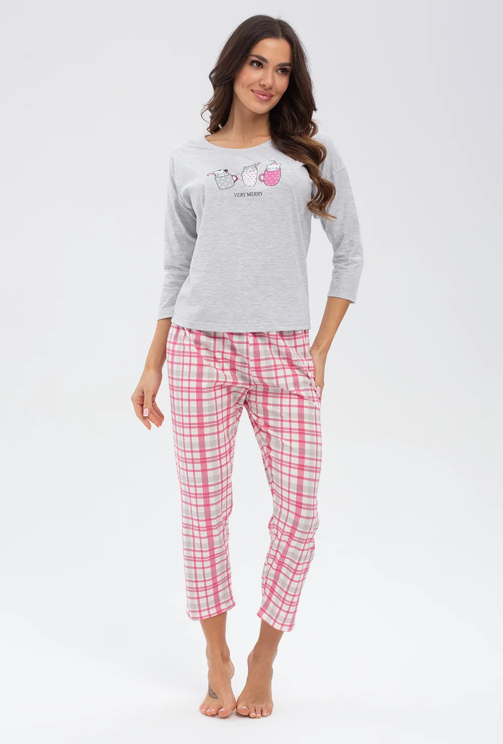 Dwuczęściowa piżama Merry składa się z bawełnianych spodni o swobodnym kroju i koszulki z nadrukiem - zarówno nogawki spodni, jak i rękawy koszulki mają długość 7/8. Ten zestaw do spania jest utrzymany w przyjemnej kolorystyce bazującej na zestawieniu różu i jasnej szarości.