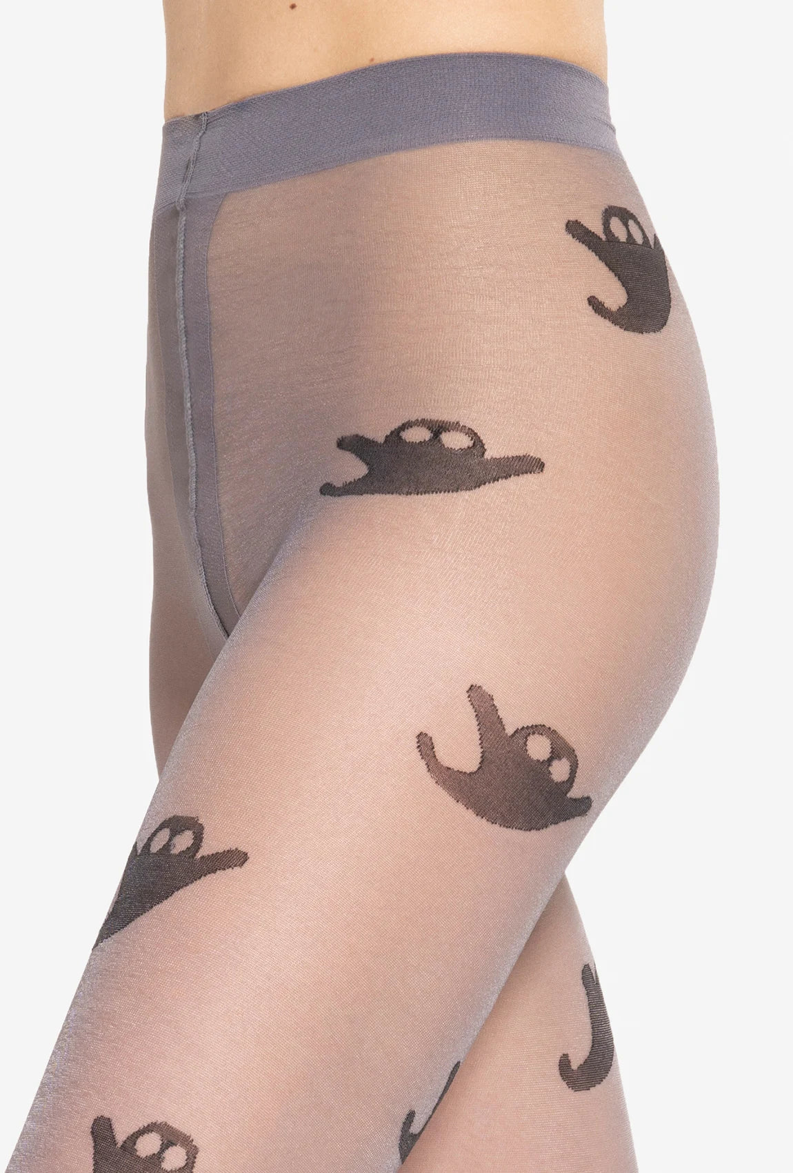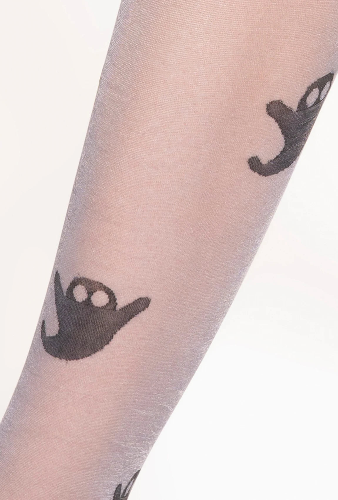 Rajstopy Crazy Trick 05 w kolorze Grafit.Nero to transparentny model z halloweenowym wzorem duszków. Lekkie, elastyczne i stylowe – idealne dla kobiet, które lubią łączyć modę z zabawą i nieoczywistymi detalami.