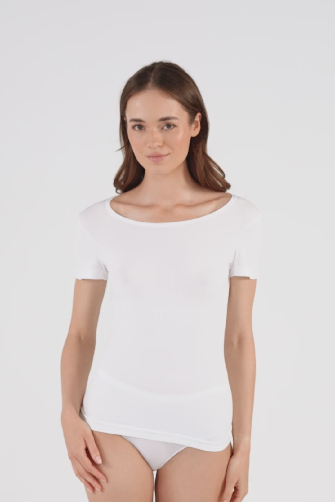 - Półkolisty, delikatny dekolt ponadczasowego T-shirtu, świetnie prezentuje się z wiosennymi sweterkami, kurtkami jeansowymi, czy służbowymi żakietami. Całość została wykonana w bezszwowej technologii. Nowe standardy dla kobiet z najwyższymi wymaganiami, zapewnią Ci pełną satysfakcję.
