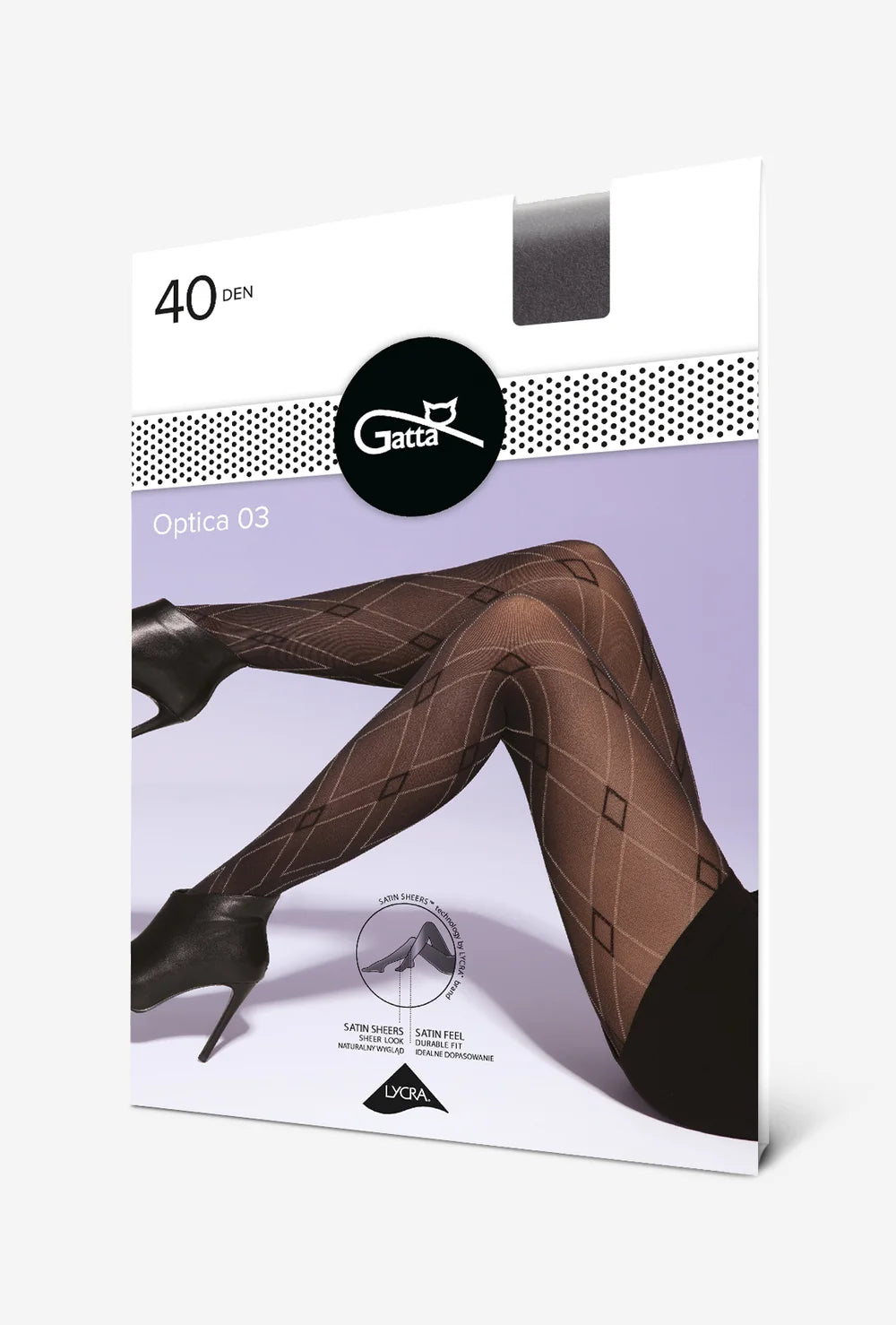 Szukasz dodatku, który wprowadzi do Twojej garderoby nutę nowoczesności oraz elegancji? Wzorzyste rajstopy w romby Optica z najnowszej kolekcji marki Gatta są odpowiedzią na Twoje potrzeby! Głównym założeniem naszych projektantów było stworzenie złudzenia efektu 3D. Połączenie linii diagonalnych w jasnobeżowym kolorze z czarnymi rombami tworzy unikalny rysunek siatki nałożonej na rajstopę o grubości 40 DEN. W połączeniu z dzianinową sukienką, skórzanymi botkami oraz beżowym trenczem stworzysz modny look w stylu lat 60.