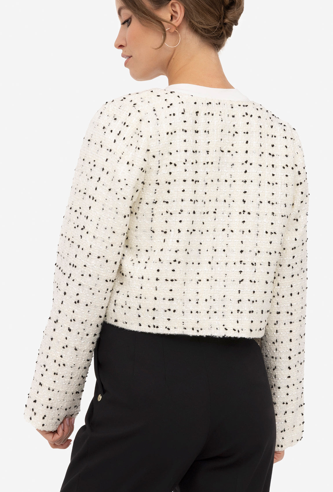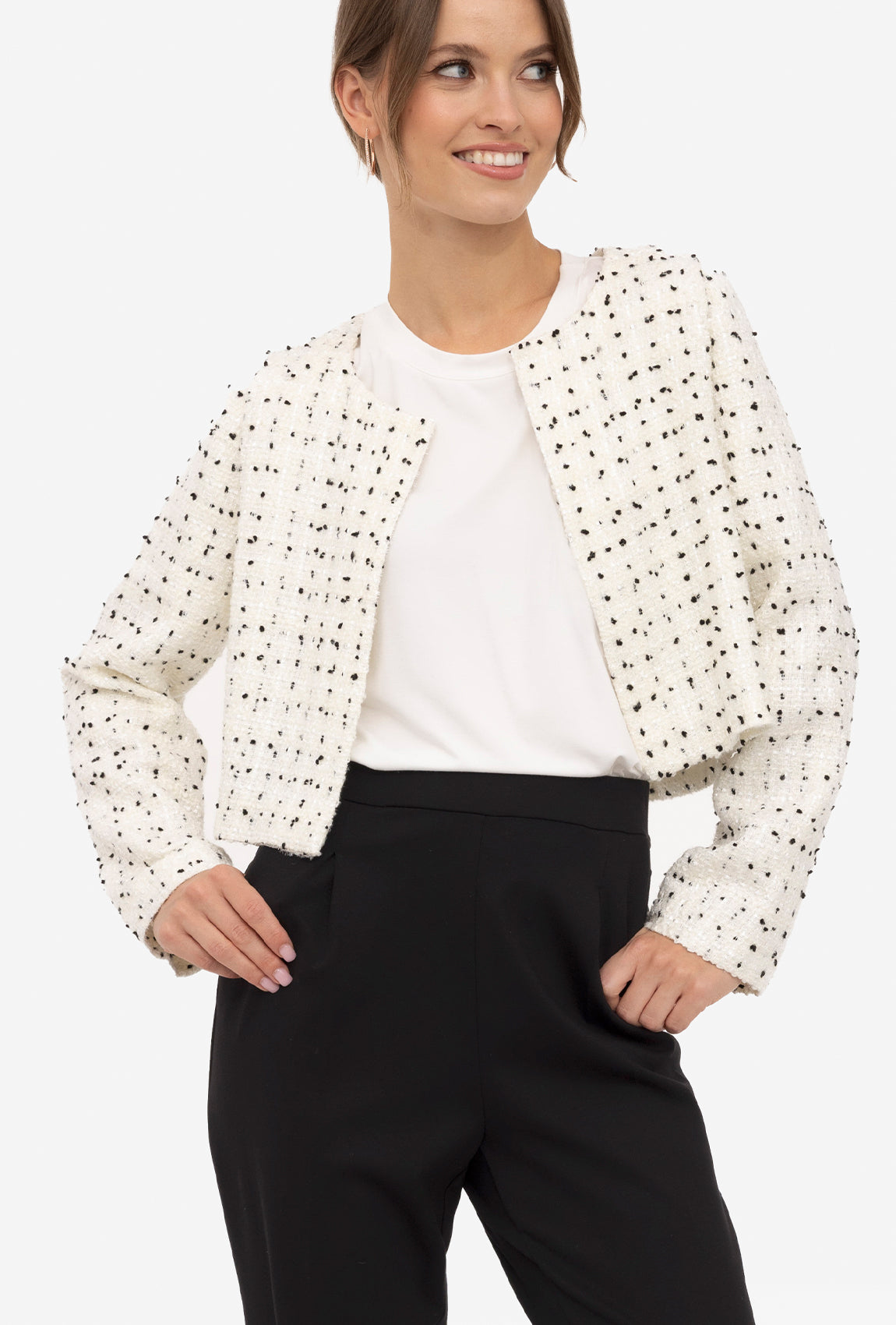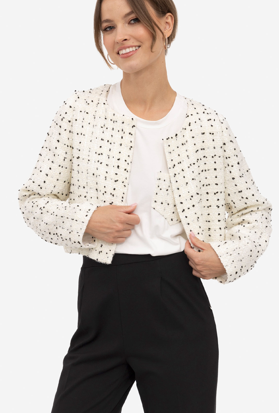 Tym, co od razu wpada w oko, jest kolorystyka żakietu Dalmatine – zasadniczy odcień to przyjemny dla oka kolor off-white (złamana, ciepła biel), na którym pojawiają się swobodnie rozrzucone czarne drobinki. Efekt przywodzi na myśl dalmatyńczyki lub mleczny deser z czekoladowymi drobinkami. Piękna estetyka i praktyczny, krótszy krój czynią damski żakiet Dalmatine niezwykle wszechstronnym i ponadczasowym wyborem.